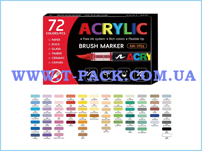 У наборі представлено 72 яскравих і насичених кольори, включаючи пастельні, класичні та глибокі відтінки. Акрилові чорнила на водній основі забезпечують рівномірне нанесення, високу покривну здатність та відмінну адгезію навіть на темних поверхнях.